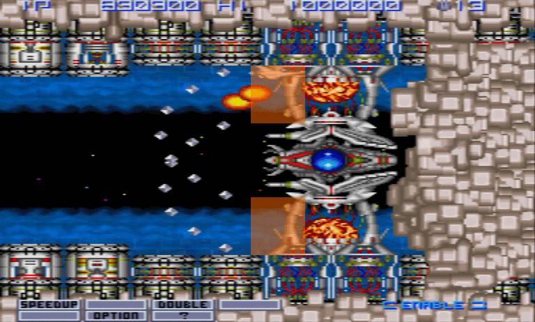 本作ではブロック地帯に入る直前にエネミースローがあるので、これを取っておけばブロックで苦労する事はないと思う。中ボス自体も OPTION と MISSILEさえあれば楽に倒せる。中ボスを抜けてもブロック地帯が少しあるので、油断して激突しないように注意する。