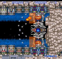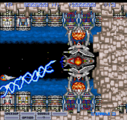 OPTIONを持っていれば微調整をして敵を破壊することができる。コアが青い時は上下砲塔から 7-WAY 弾が 6 回、コアが赤い時は雷レーザーが 7 回飛んでくる。コアを撃つと打ち返しの雷レーザーが飛んでくる。